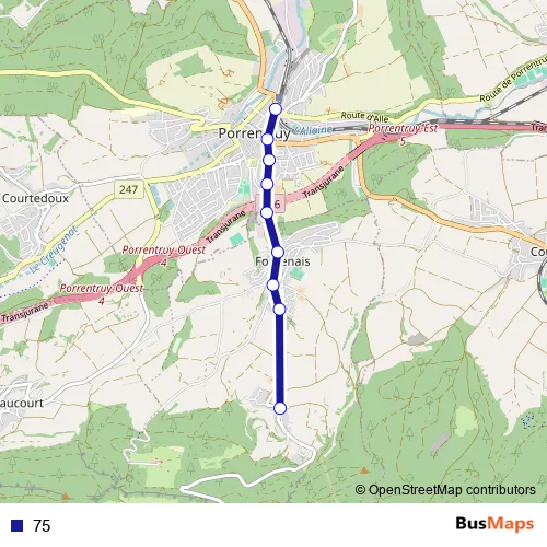 The first stop of the 75 bus route is Villars-sur-Fontenais and the last stop is Porrentruy, gare. 75 is operational during täglich.