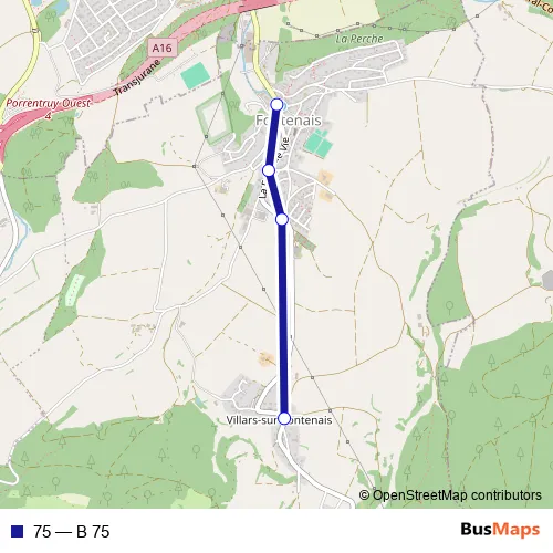 The first stop of the 75 bus route is Fontenais,place de la Fontaine and the last stop is Villars-sur-Fontenais. 75 (B 75) is operational during an Werktagen.