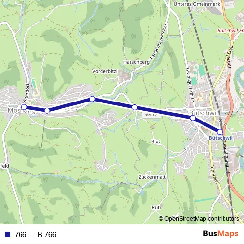 The first stop of the 766 bus route is Bütschwil, Bahnhof and the last stop is Mosnang, Dorf. 766 (B 766) is operational during täglich.