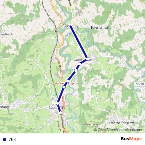 The first stop of the 768 bus route is Lütisburg, Dorf and the last stop is Bütschwil, Bahnhof. 768 is operational during täglich.