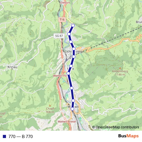 The first stop of the 770 bus route is Lichtensteig, Steigrüti and the last stop is Wattwil, Bahnhof. 770 (B 770) is operational during täglich.