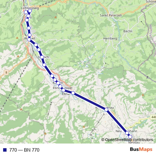 The first stop of the 770 bus route is Nesslau-Neu St.Johann, Bahnhof and the last stop is Lichtensteig, Bahnhof. 770 (BN 770) is operational during am Wochenende.