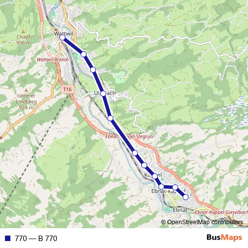 The first stop of the 770 bus route is Wattwil, Bahnhof and the last stop is Ebnat-Kappel, Wier. 770 (B 770) is operational during täglich.