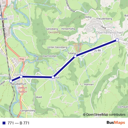 The first stop of the 771 bus route is Oberhelfenschwil, Dorf and the last stop is Dietfurt, Bahnhof. 771 (B 771) is operational during täglich.
