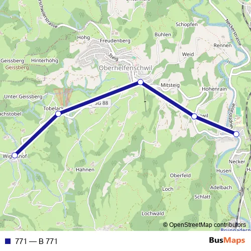 The first stop of the 771 bus route is Necker, Grütli and the last stop is Oberhelfenschwil, Wigetshof. 771 (B 771) is operational during an Werktagen.