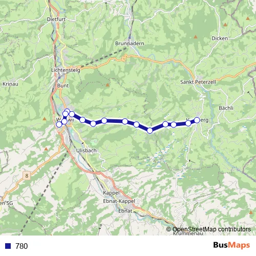 The first stop of the 780 bus route is Hemberg, Dorf and the last stop is Wattwil, Klinik. 780 is operational during täglich.