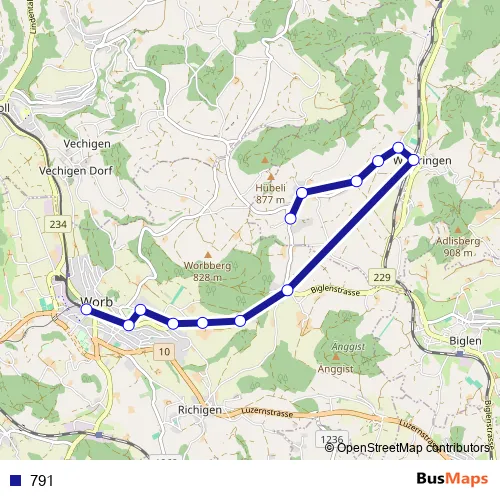 The first stop of the 791 bus route is Worb Dorf, Bahnhof and the last stop is Walkringen, Bahnhof. 791 is operational during täglich.