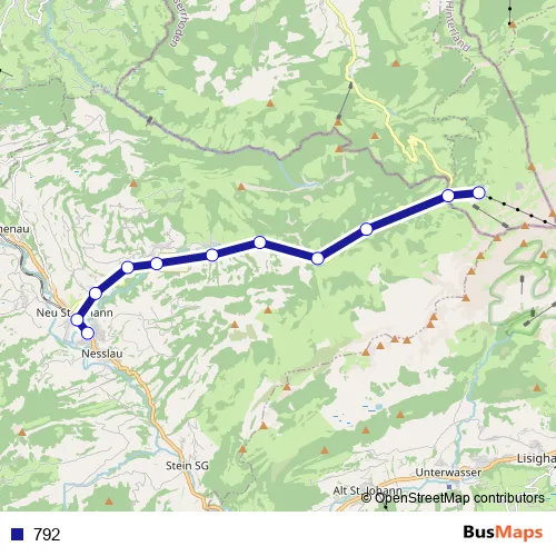 The first stop of the 792 bus route is Schwägalp, Säntis-Schwebebahn and the last stop is Nesslau-Neu St.Johann, Bahnhof. 792 is operational during täglich.