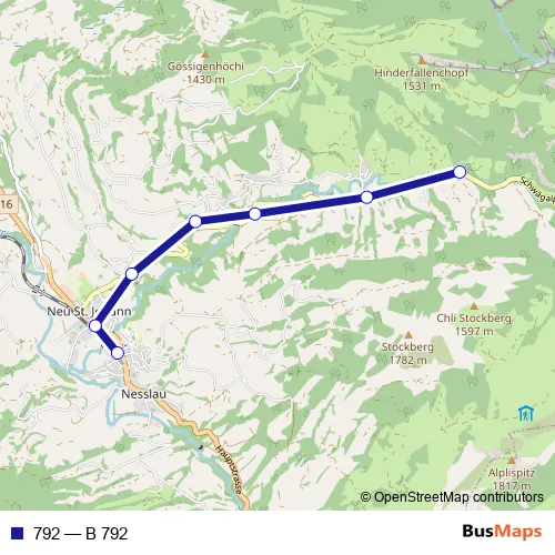 The first stop of the 792 bus route is Ennetbühl, Seebensäge and the last stop is Nesslau-Neu St.Johann, Bahnhof. 792 (B 792) is operational during täglich.