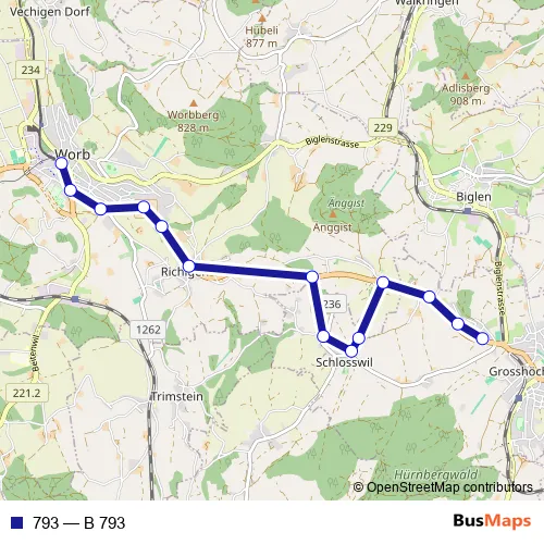 The first stop of the 793 bus route is Worb Dorf, Bahnhof and the last stop is Grosshöchstetten, Talacker. 793 (B 793) is operational during täglich.
