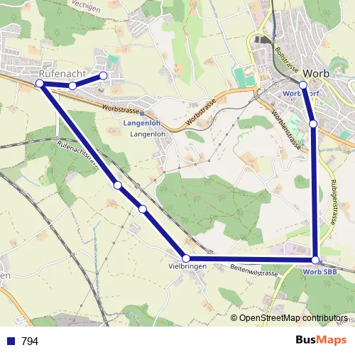 The first stop of the 794 bus route is Worb Dorf, Bahnhof and the last stop is Rüfenacht, Sperlisacher. 794 is operational during täglich.