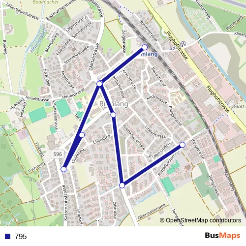 The first stop of the 795 bus route is Rümlang, Ifangstrasse and the last stop is Rümlang, Zürichweg. 795 is operational during an Werktagen.