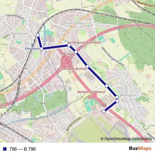 The first stop of the 796 bus route is Dietlikon, Bahnhof/Bad and the last stop is Wangen b D'dorf, Flugsicherung. 796 (B 796) is operational during an Werktagen.