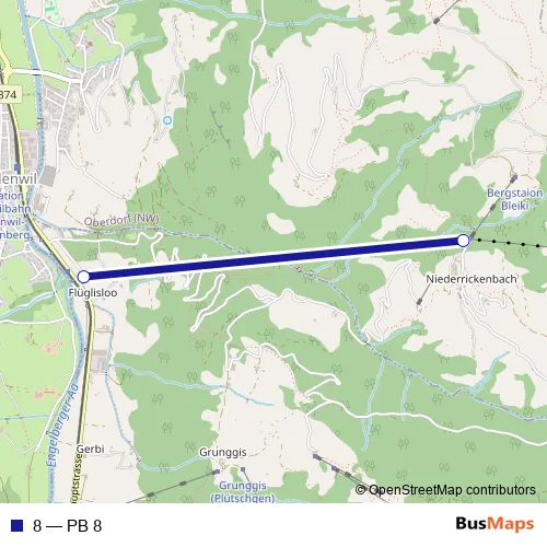 The first stop of the 8 cable-car route is Niederrickenbach Dorf and the last stop is Niederrickenbach Talstation. 8 (PB 8) is operational during täglich.