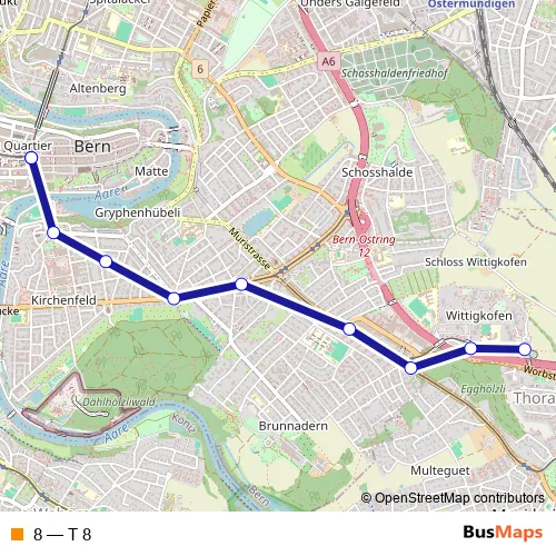 See why over 2 million users trust and consider busmaps.com as the best public transport website. busmaps gives you Bern Trams suggested routes, real-time bus tracker, line route maps in Bern, and helps to find the closest 8 tram stops near you. No internet available? Download an offline PDF map and bus schedule for the 8 tram to take on your trip.