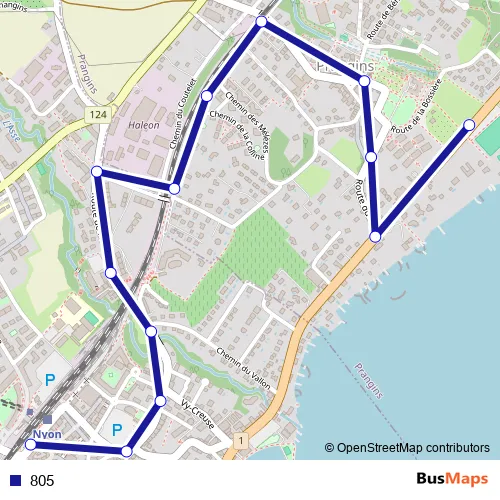 The first stop of the 805 bus route is Prangins, Les Abériaux and the last stop is Nyon, gare. 805 is operational during täglich.