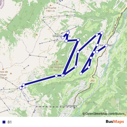 The first stop of the 81 bus route is Val-d'Illiez, gare and the last stop is Les Crosets, télésièges. 81 is operational during täglich.