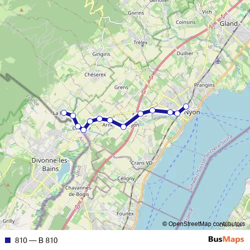 The first stop of the 810 bus route is La Rippe, village and the last stop is Nyon, gare. 810 (B 810) is operational during täglich.