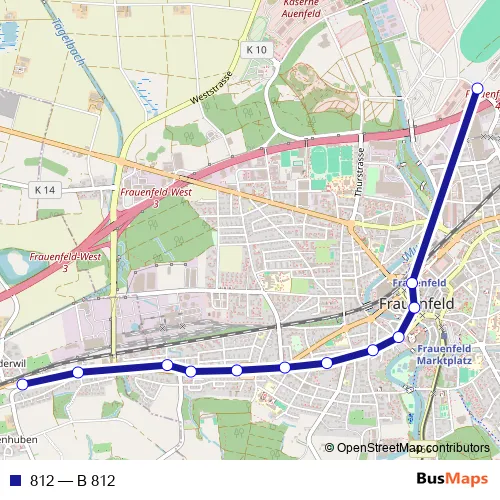 The first stop of the 812 bus route is Frauenfeld, Grosse Allmend and the last stop is Frauenfeld, Sandbüel. 812 (B 812) is operational during täglich.