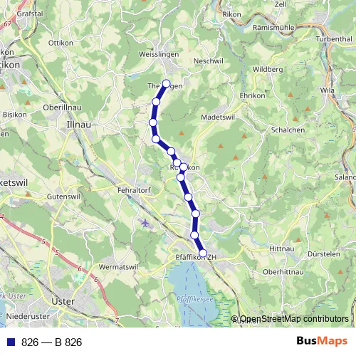 The first stop of the 826 bus route is Theilingen, Post and the last stop is Pfäffikon ZH, Bahnhof. 826 (B 826) is operational during an Werktagen.