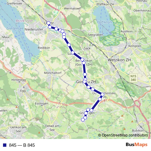 The first stop of the 845 bus route is Uster, Bahnhof and the last stop is Grüningen, Adler. 845 (B 845) is operational during täglich.