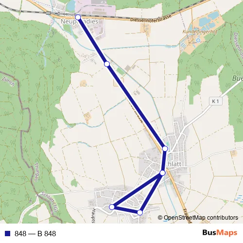 The first stop of the 848 bus route is Schlatt TG, Gemeindehaus and the last stop is Schlatt TG, Bahnhof. 848 (B 848) is operational during an Werktagen.