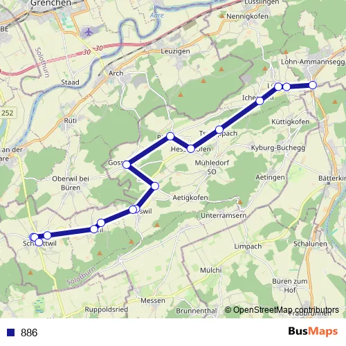 The first stop of the 886 bus route is Lohn-Lüterkofen, Bahnhof and the last stop is Schnottwil, Post. 886 is operational during täglich.