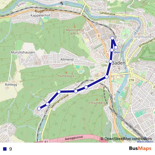 The first stop of the 9 bus route is Baden, Alterszentrum and the last stop is Baden, Bahnhof Ost. 9 is operational during täglich.