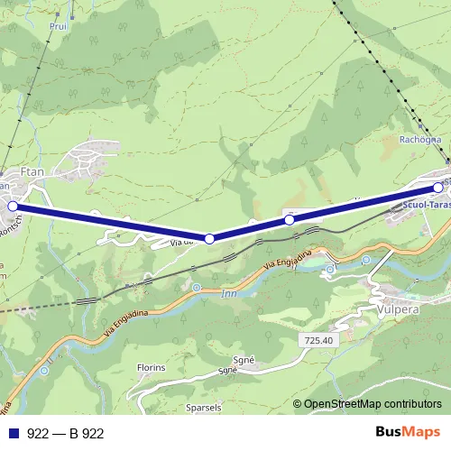 The first stop of the 922 bus route is Scuol-Tarasp, staziun and the last stop is Ftan, cumün. 922 (B 922) is operational during täglich.
