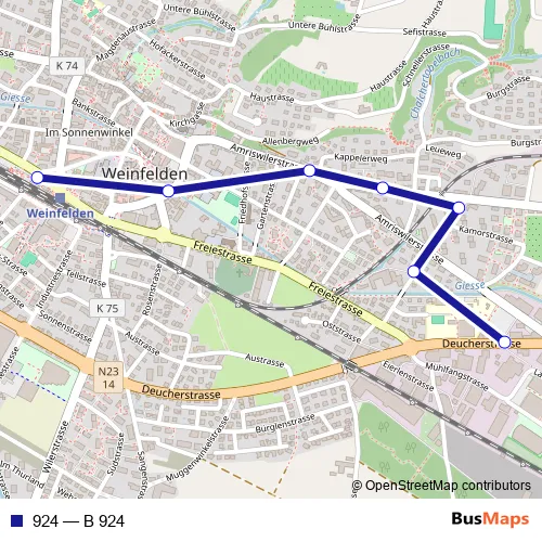 The first stop of the 924 bus route is Weinfelden, Bahnhof and the last stop is Weinfelden, Güttingersreuti. 924 (B 924) is operational during täglich.