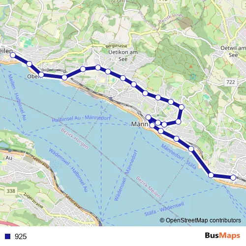 The first stop of the 925 bus route is Meilen, Bahnhof and the last stop is Stäfa, Bahnhof. 925 is operational during täglich.