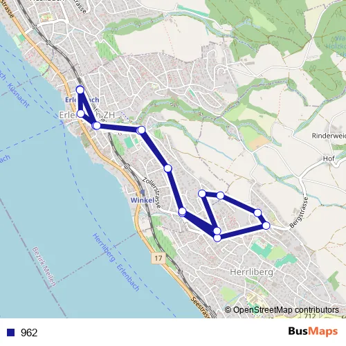 The first stop of the 962 bus route is Erlenbach ZH, Bahnhof and the last stop is Erlenbach ZH, Bahnhof. 962 is operational during täglich.
