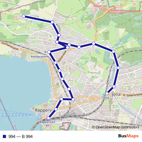 The first stop of the 994 bus route is Jona, Bahnhof and the last stop is Rapperswil SG, Bahnhof. 994 (B 994) is operational during täglich.