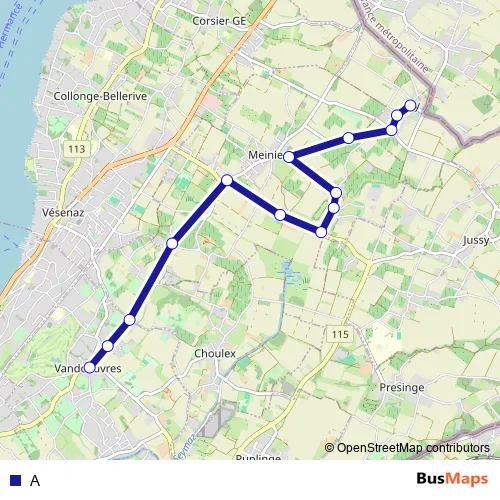 The first stop of the A bus route is Gy, temple and the last stop is Vandoeuvres, village. A is operational during an Werktagen.