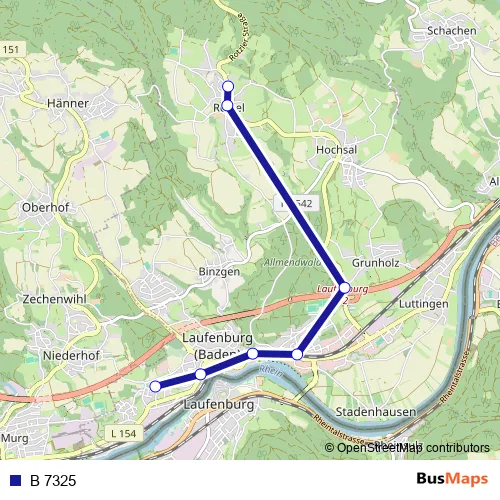 See why over 2 million users trust and consider busmaps.com as the best public transport website. busmaps gives you Laufenburg Buses suggested routes, real-time bus tracker, line route maps in Laufenburg, and helps to find the closest B 7325 bus stops near you. No internet available? Download an offline PDF map and bus schedule for the B 7325 bus to take on your trip.
