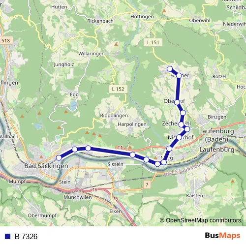 The first stop of the B 7326 bus route is Hänner, Oberdorf and the last stop is Bad Säckingen, Bahnhof. B 7326 is operational during an Werktagen.
