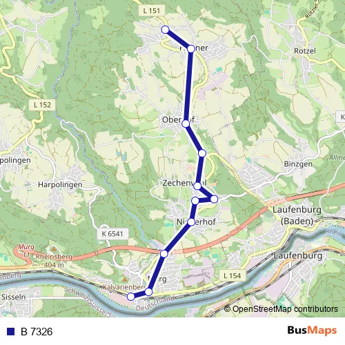 The first stop of the B 7326 bus route is Hänner, Oberdorf and the last stop is Murg (Baden), Bahnhof. B 7326 is operational during täglich.