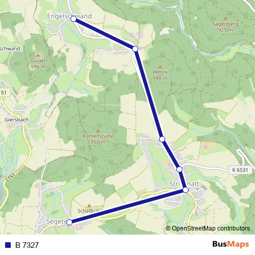 The first stop of the B 7327 bus route is Engelschwand, Denkmal and the last stop is Segeten. B 7327 is operational during an Werktagen.