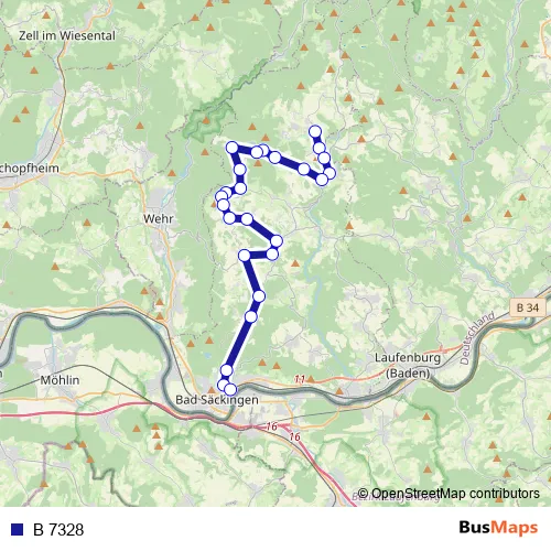 The first stop of the B 7328 bus route is Herrischried, Rathaus and the last stop is Bad Säckingen, Bahnhof. B 7328 is operational during an Werktagen.