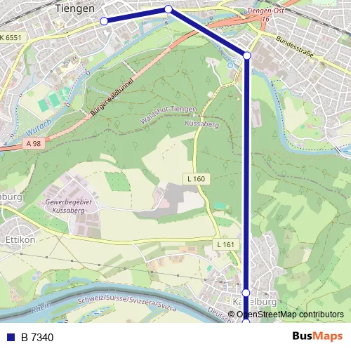 The first stop of the B 7340 bus route is Kadelburg, Post and the last stop is Tiengen (WT), Stadtmitte. B 7340 is operational during an Werktagen.