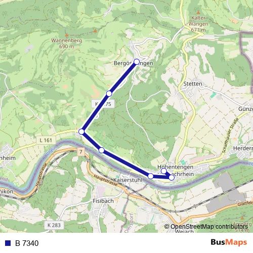 The first stop of the B 7340 bus route is Hohentengen, Gms and the last stop is Bergöschingen. B 7340 is operational during täglich.
