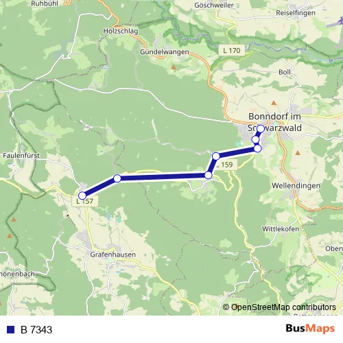 The first stop of the B 7343 bus route is Bonndorf, Schwarzwaldhotel and the last stop is Grafenhausen, Rothaus. B 7343 is operational during täglich.