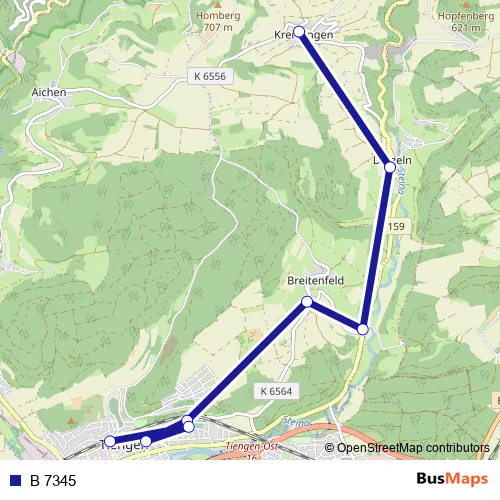 The first stop of the B 7345 bus route is Krenkingen and the last stop is Tiengen (Hochrhein), Bahnhof. B 7345 is operational during an Werktagen.