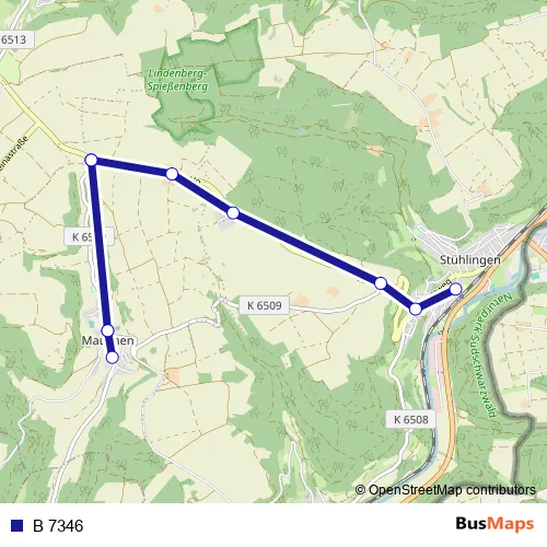 The first stop of the B 7346 bus route is Untere Alp, Abzw Mauchen and the last stop is Stühlingen, Schulzentrum. B 7346 is operational during an Werktagen.