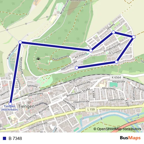 The first stop of the B 7348 bus route is Tiengen (WT), Terrassenhaus W. and the last stop is Tiengen (Hochrhein), Bahnhof. B 7348 is operational during an Werktagen.