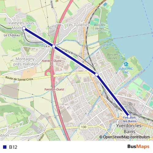 The first stop of the B12 bus route is Valeyres-s.-M., centre sportif and the last stop is Yverdon-les-Bains, gare. B12 is operational during an Werktagen.