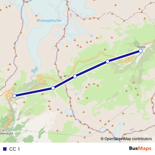 The first stop of the CC 1 rail route is Gletsch and the last stop is Realp Dfb. CC 1 is operational during am Wochenende.