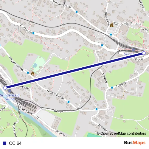 The first stop of the CC 64 rail route is Grindelwald Grund and the last stop is Grindelwald. CC 64 is operational during täglich.