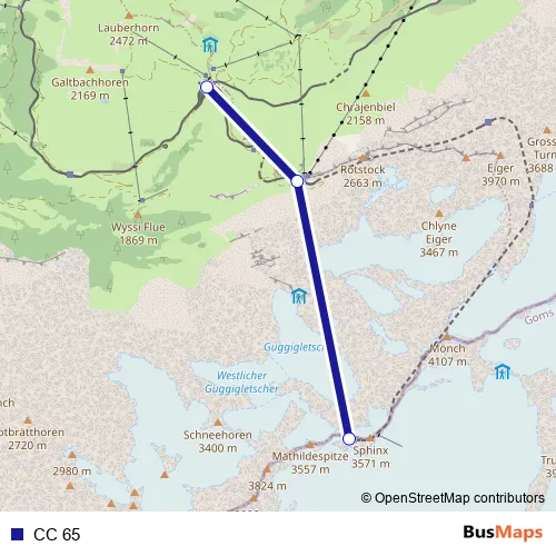 The first stop of the CC 65 rail route is Kleine Scheidegg and the last stop is Jungfraujoch. CC 65 is operational during täglich.