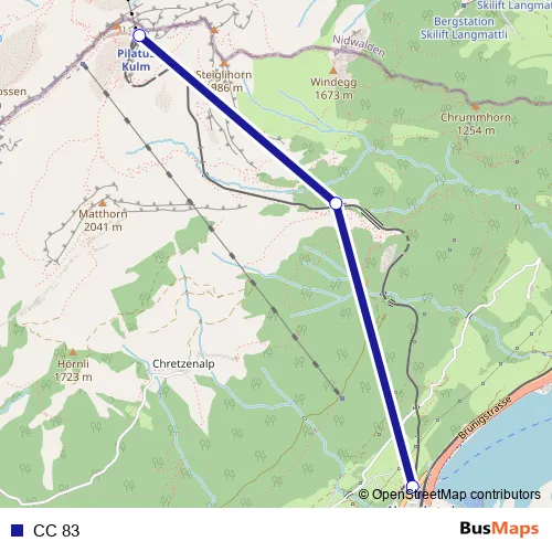 The first stop of the CC 83 rail route is Pilatus Kulm and the last stop is Alpnachstad Pb. CC 83 is operational during täglich.